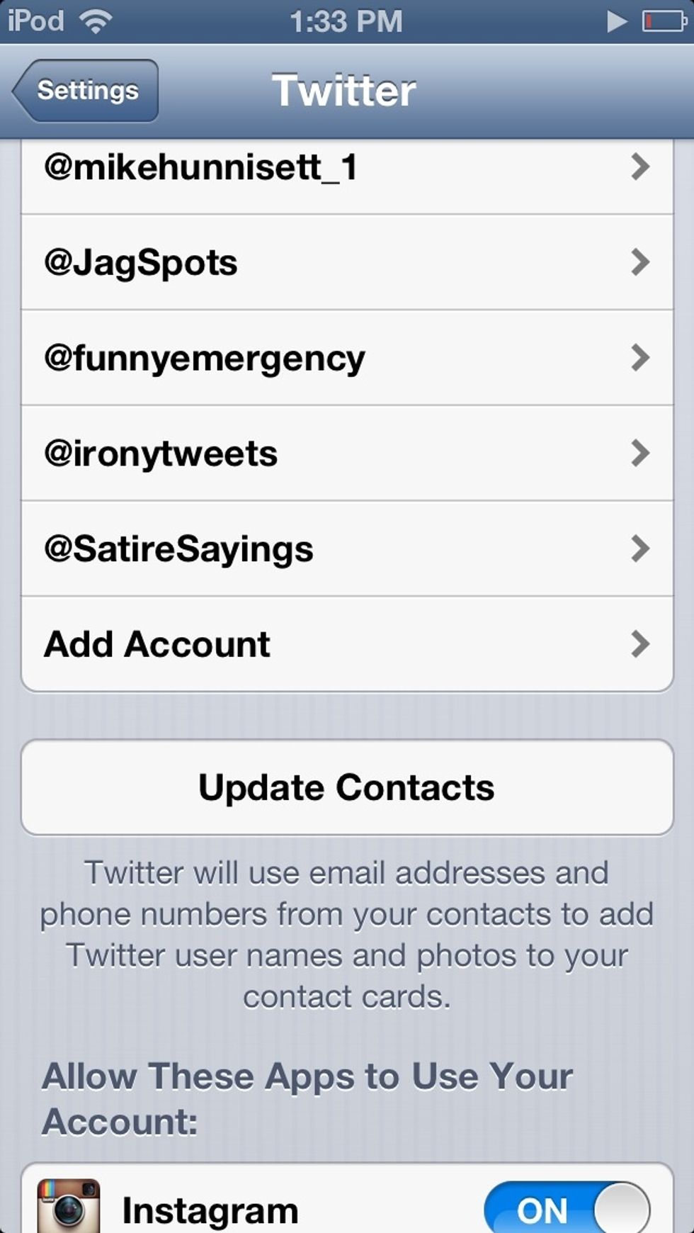 Here is the twitter example. Once you press update contacts, it will add any new friends you have made, and update the information of your current friends too.