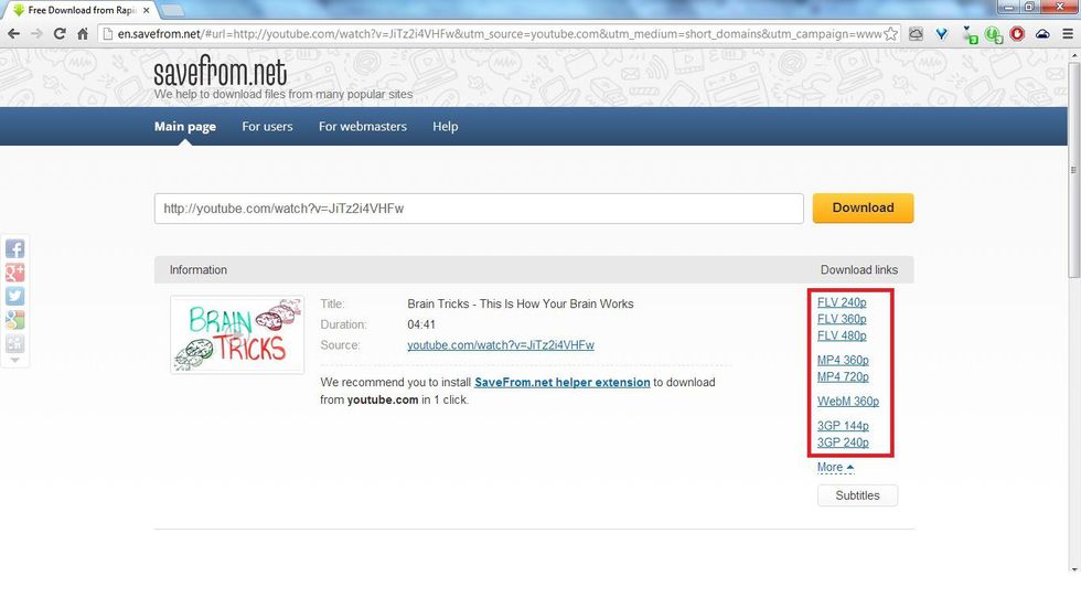 We now just add the two letters: ss after www. Before: www.youtube.com/...... After: www.ssyoutube.com/......