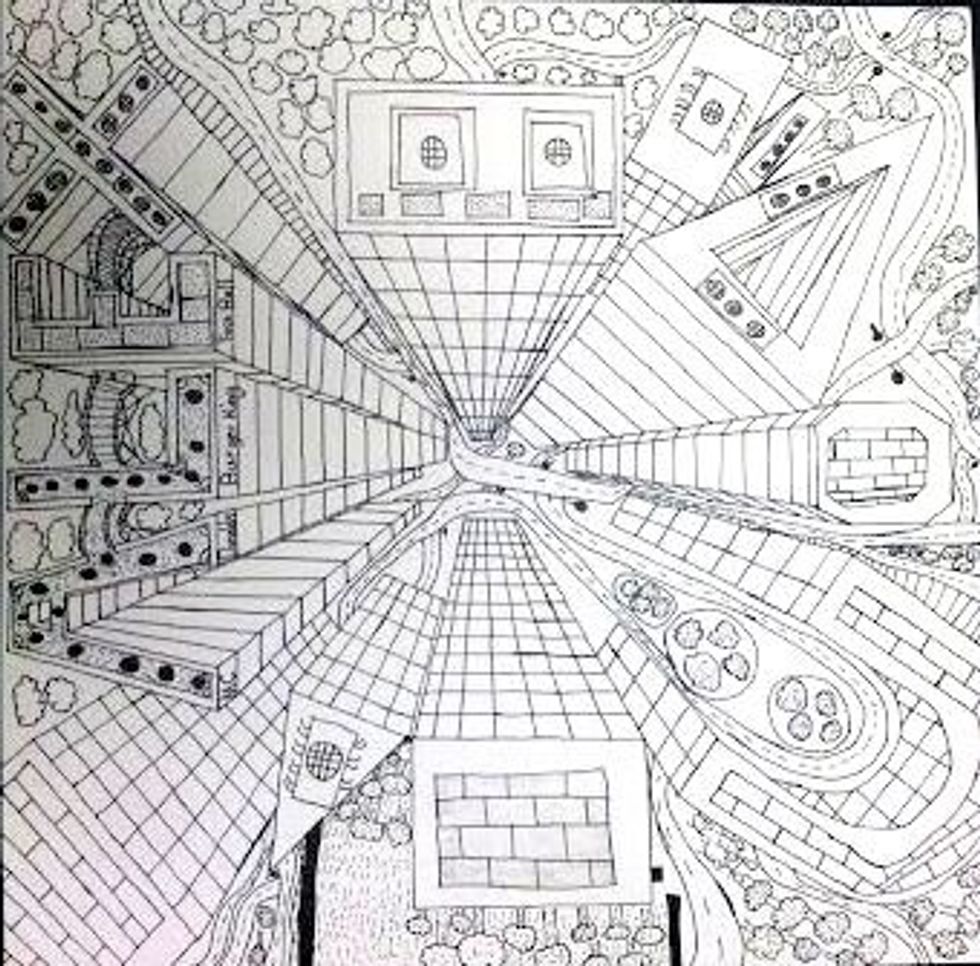 Then have fun adding windows, roads, tops of trees and details to the top of your buildings! Finish your drawing by outlining it with sharpie.