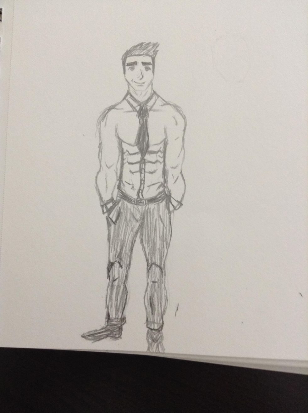 Draw belt and make the upper body look more like a long sleeve shirt.(sort of draw around the body you drew to make it look like he's wearing a shirt)