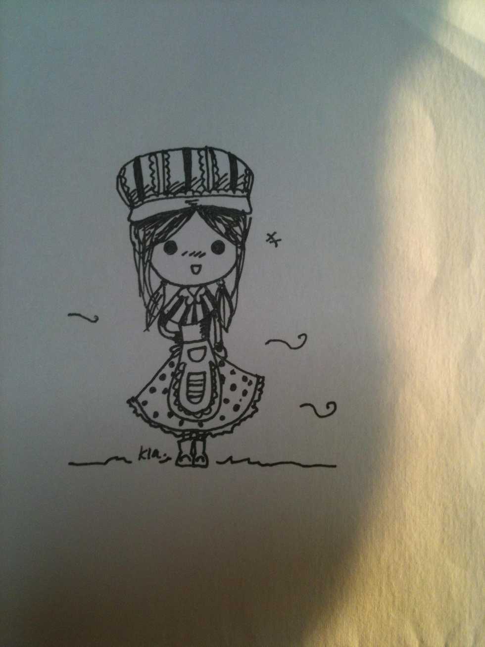 Add a hat.Add some hair.The face.Big eyes! A happy expression.Collar.Small cape.A shirt.An apron.Wavy big dress!!Boots.Add your own pattern. It's the same picture. Wow.Finished! Add your sign and the background.