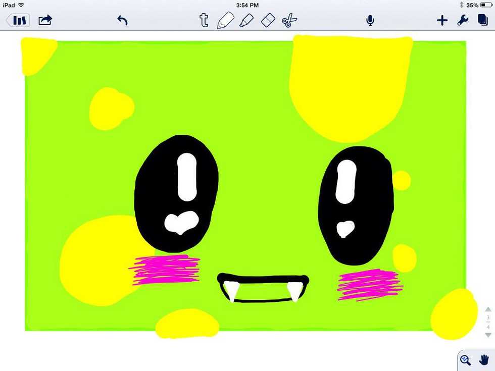 Draw a green boxThen color it in with green markerThen add some yellow spotsThen add two or more eyes but I just did twoThen add the little monster blushingAnd then add the mouthThen you are done with the monster hope you enjoyed.😄