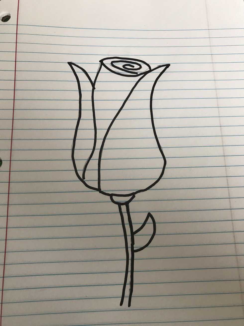 Start by drawing curves for the roseThen twirl it at the topNext draw leave shapesMake the bulb at the bottomMake a stemLeavesNow I'm outlining it in sharpie this is optionalAnd here's the rose! Thanks Myranda for requesting this guide