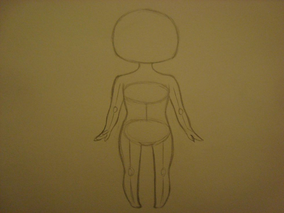 Next, you draw two lines on each side down to the feet. Make sure you curve the line towards the inside between the two ovals, and at the small circle where the knee is.