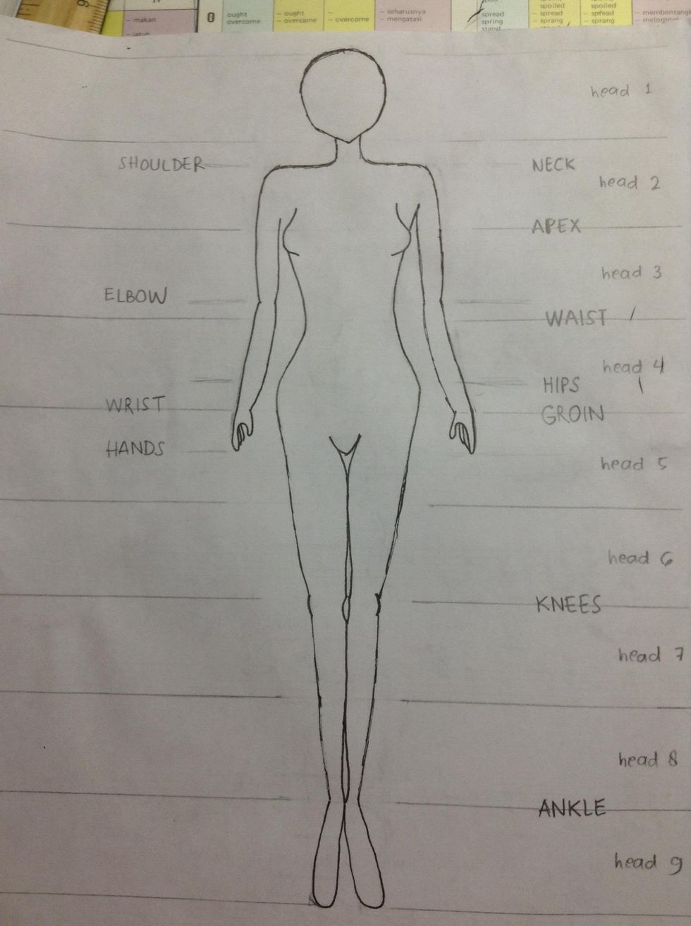 these are the other guidelines: neck and shoulder at upper third of head 2. the line between 2nd and 3rd head is the apex. lower sixth of head 3 is elbow. line between head 3 and 4 is the waist.