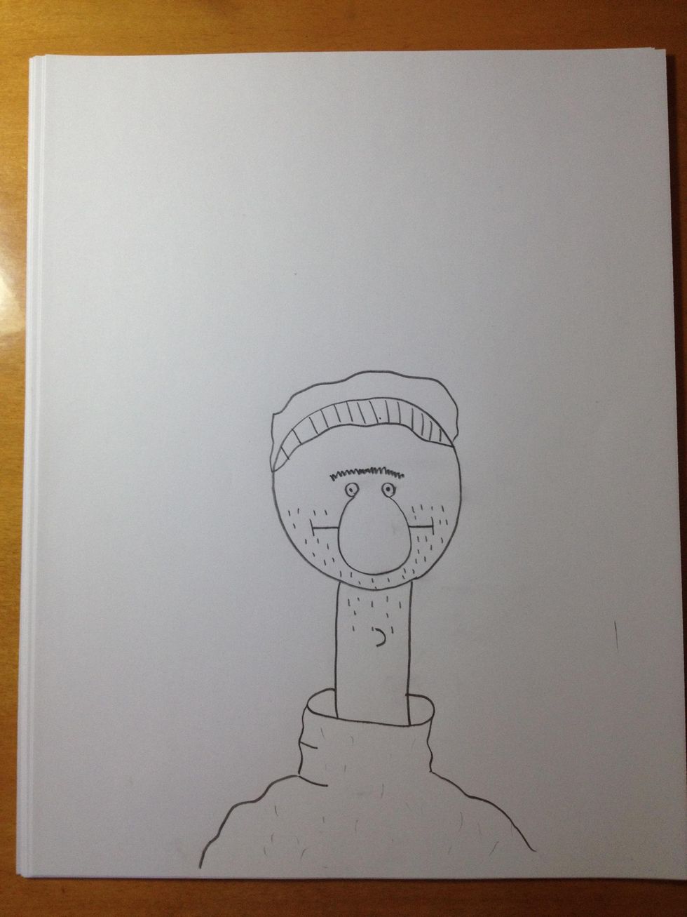Draw a long neck with a collar.(he is wearing a baggy sweater)