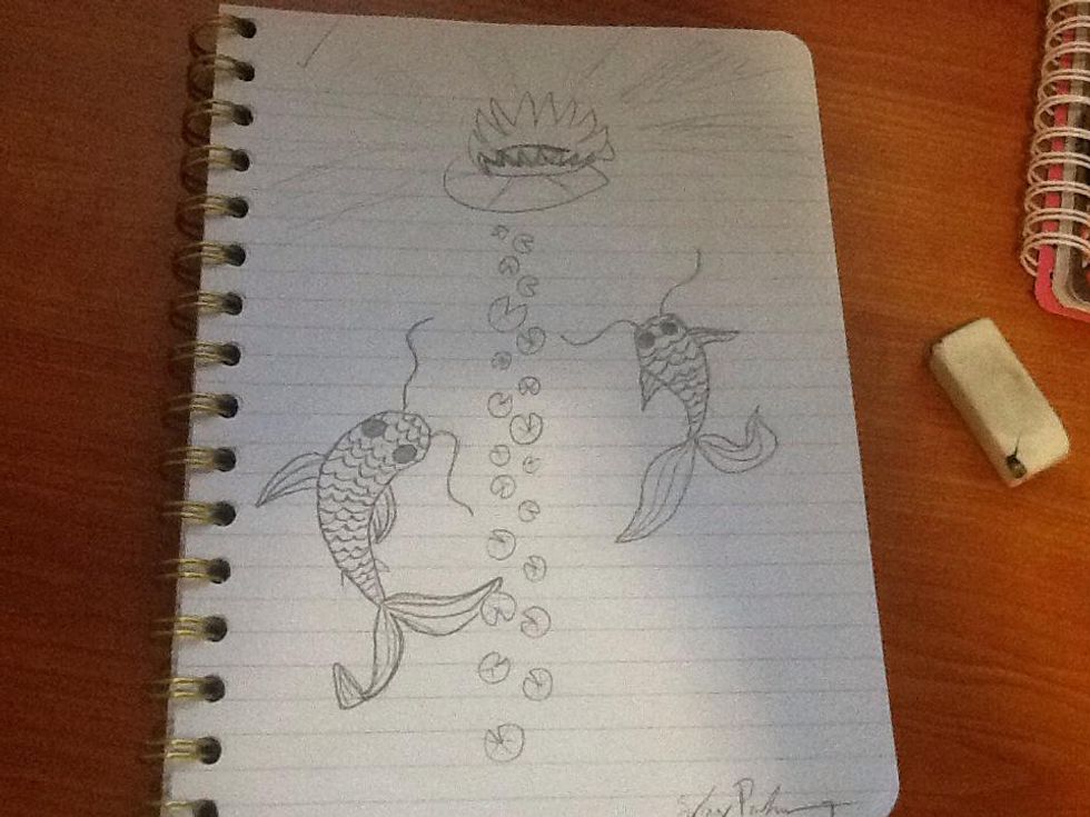 Go back over your drawing with darker marks and color with the colored pencils. Orange=fish Pink=flower Blue=water Green=lily pads.