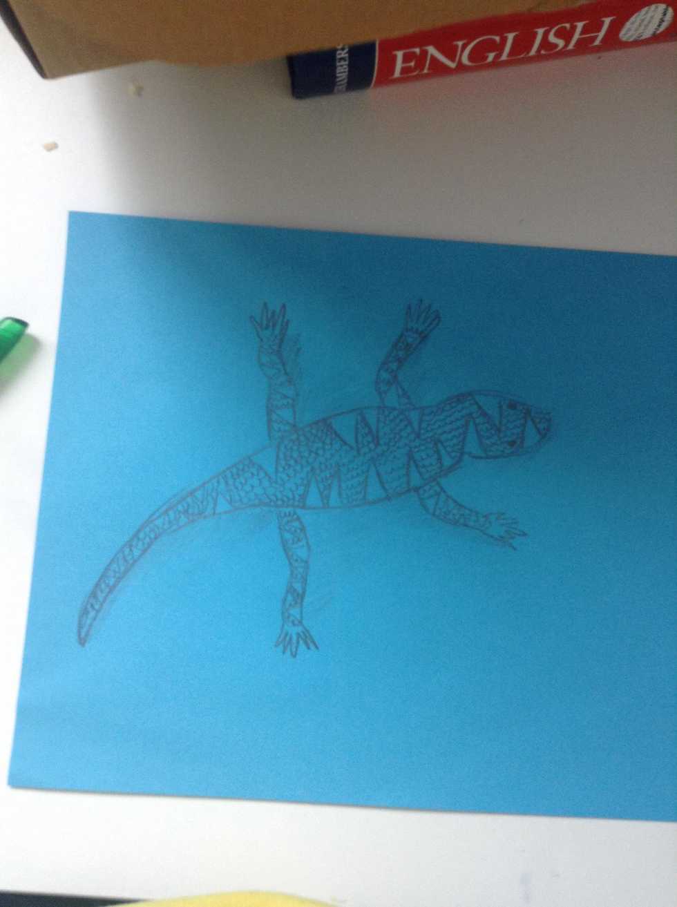 then draw to short arms up by the head and again do the same thing with the fingers now this should look more like a lizard