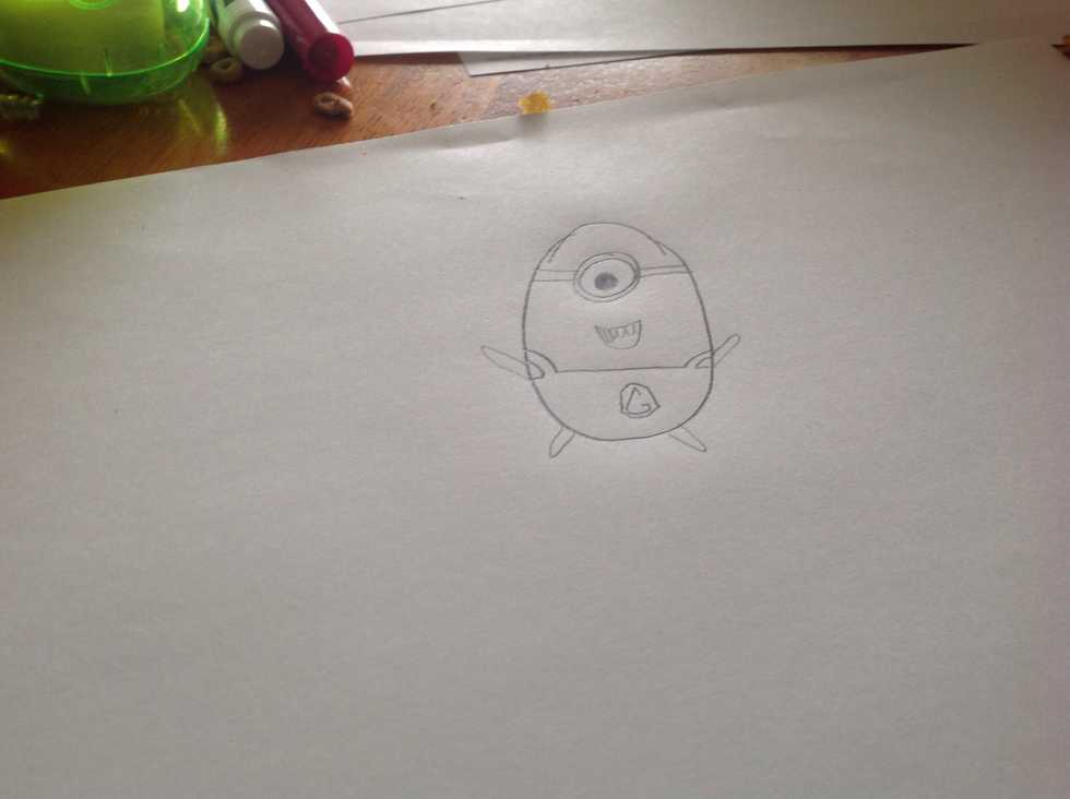 First draw an ovalThen draw two circles inside each other. Then the strapsThen draw the overallsDraw the gru signDraw the mouthArms and legsThen color