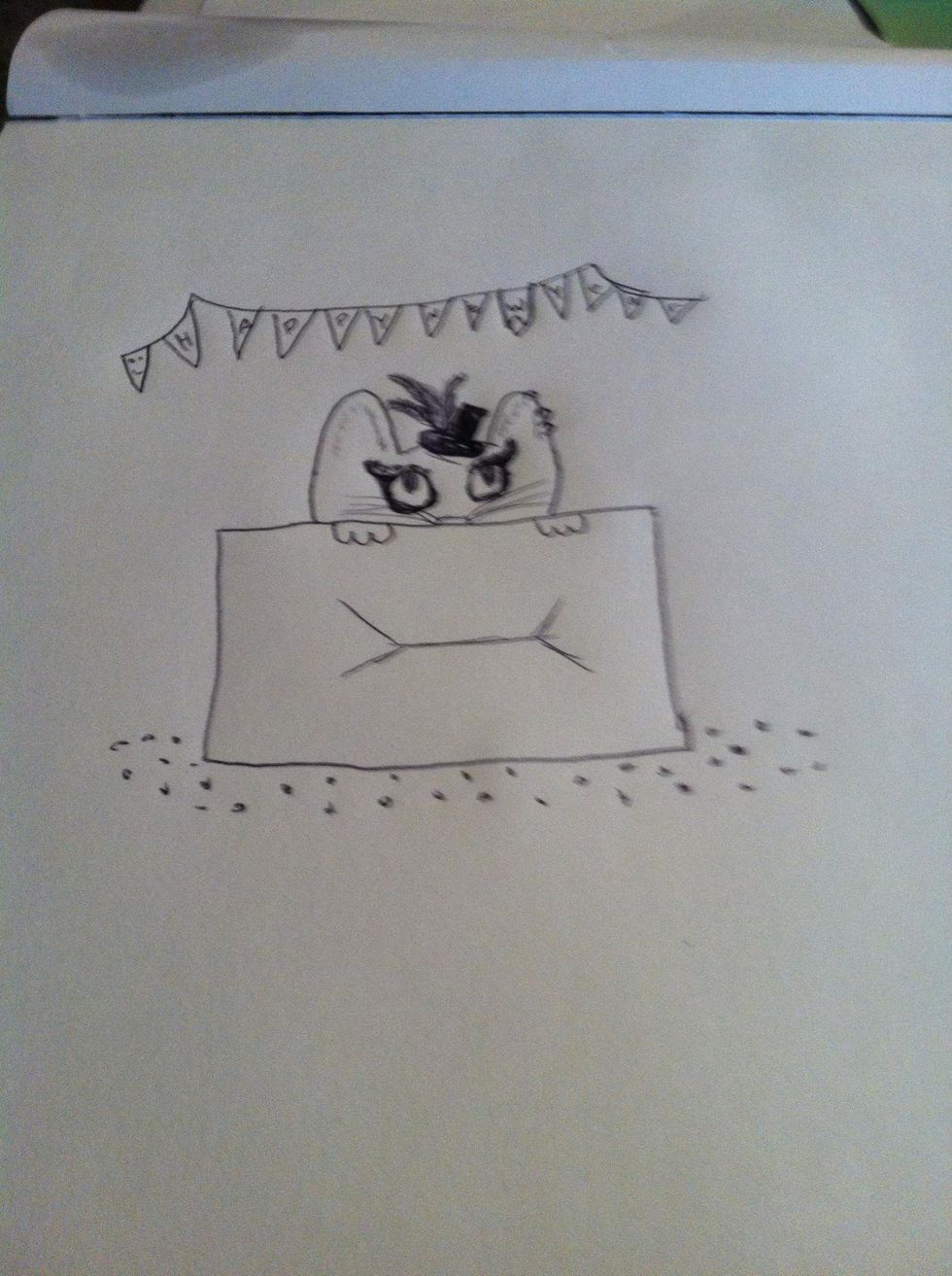 Start by drawing two ears attached to the top of a headThen draw two cute eyes and a nose with whiskers. Even add fluff on the ears if you wantAdd a hat, paws, ad the rest of a box. 😺Even add decorations 🎉🎊🎈