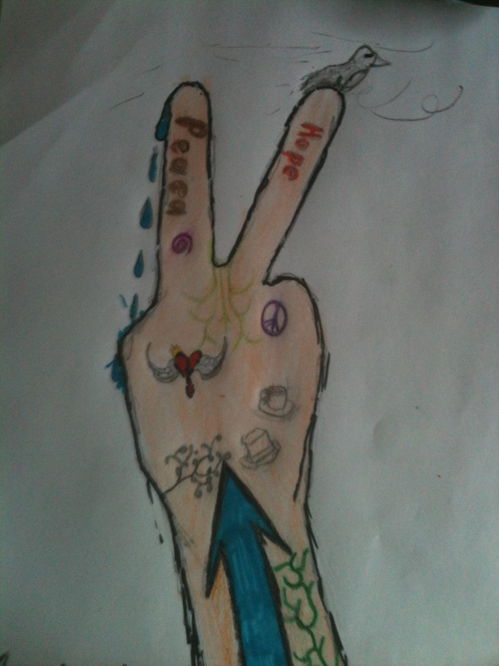Get your supplies readyGet your paper and trace your hand in a peace sign positionAfter tracingFix it up a little to your likingShadeFill in with different stuff only if you want toColor in and doneHere it is hope you like it