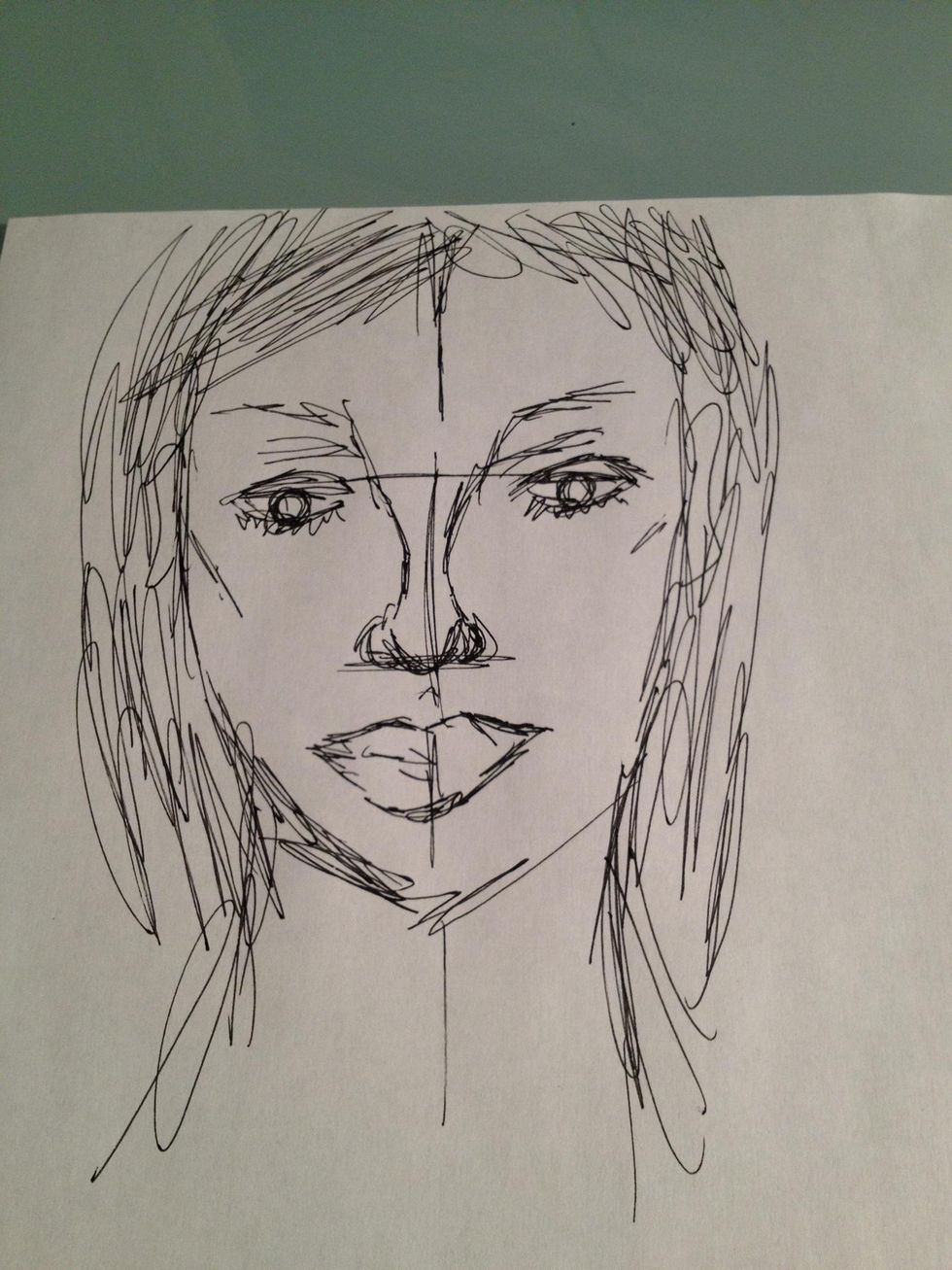 Now start to shape the face, draw a line straight up from the center of the nose, (2-3 inches) and down from the tip about same distance. Connect the lines with a rounded line on each side of the face