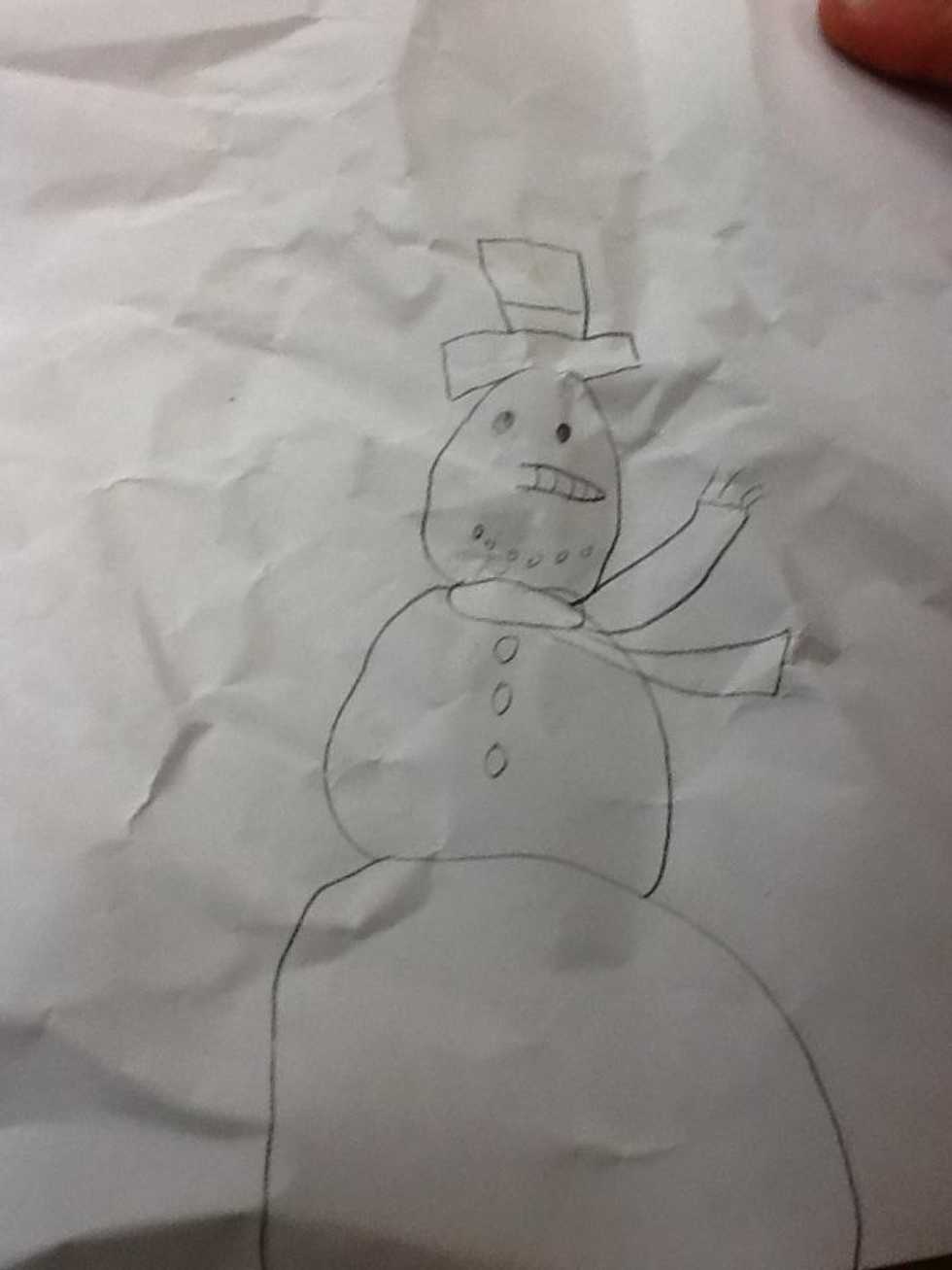First,draw a semi circle at the edge of the piece of paperNext, put a smaller circle on the semi circle.Draw one more circle on top of the other circles.Now you can add eyes, a nose, buttons , and more.