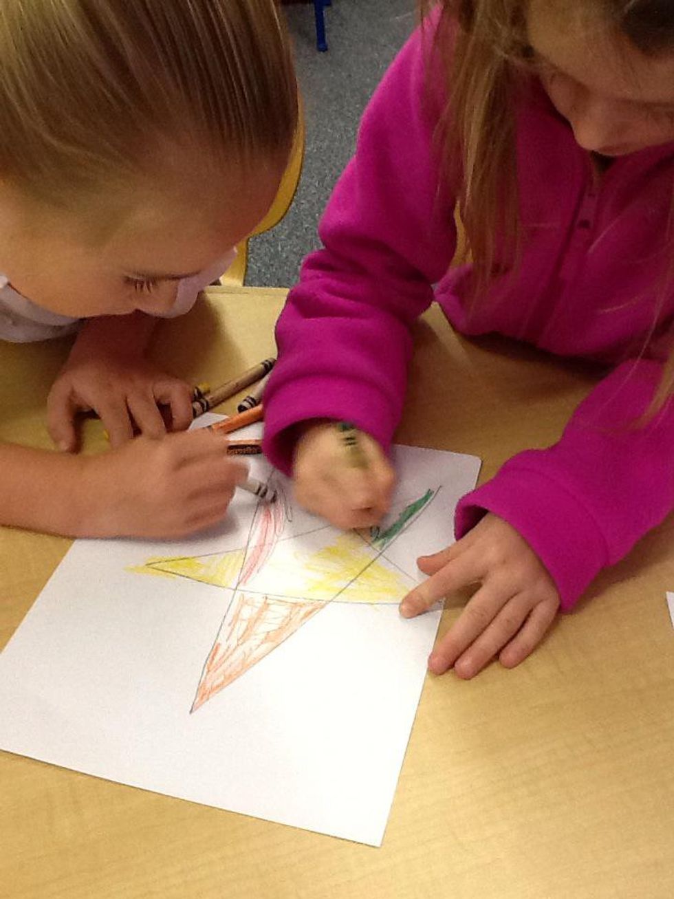 Draw an upside down "V"Then, make a diagonal line.Make a line across the top.Make one more diagonal line.Now you have a star!Color the star!
