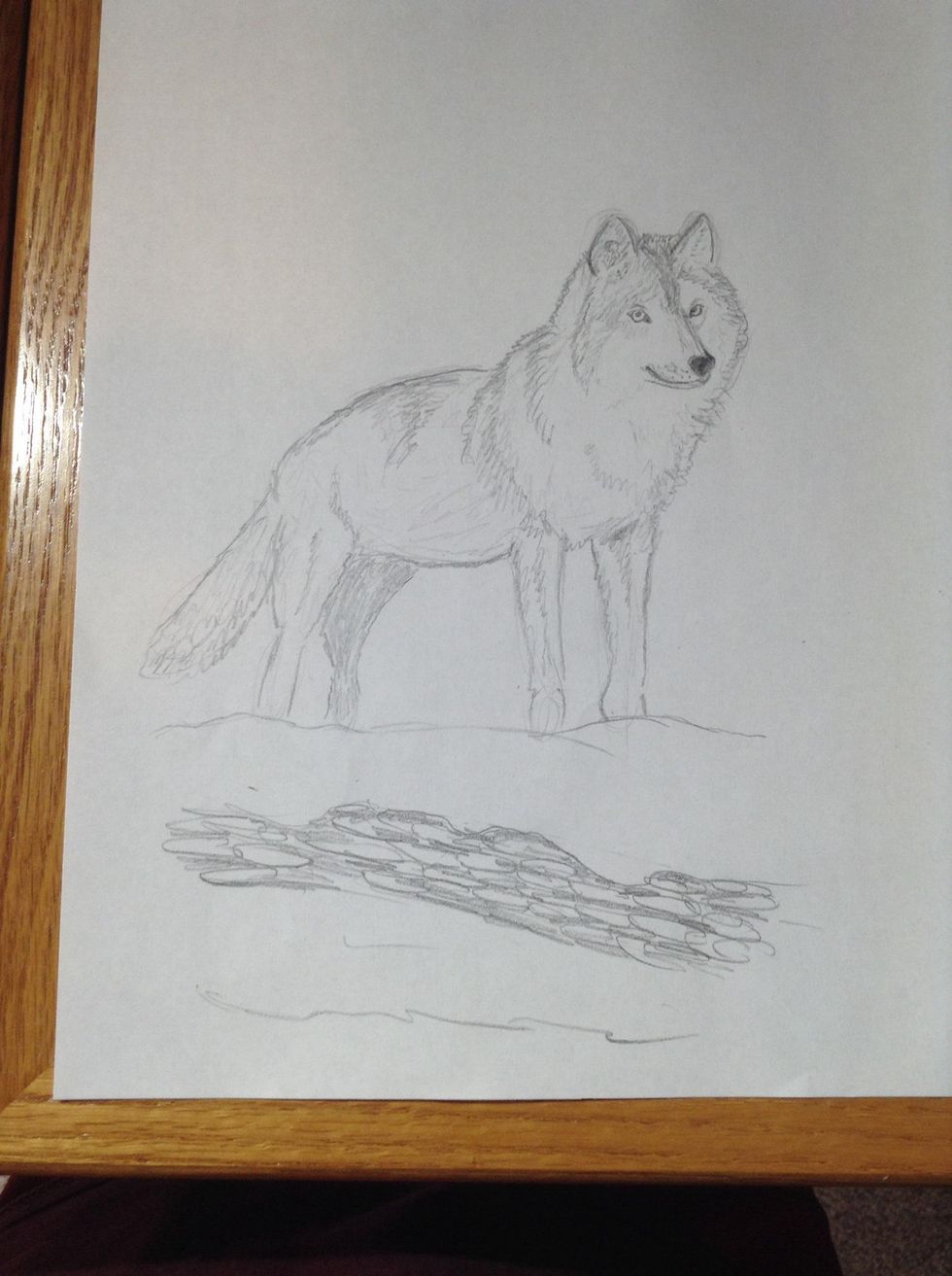 Shade in the nose, add some detail around the mouth, and draw in the snow. I chose to add a log, it's optional.