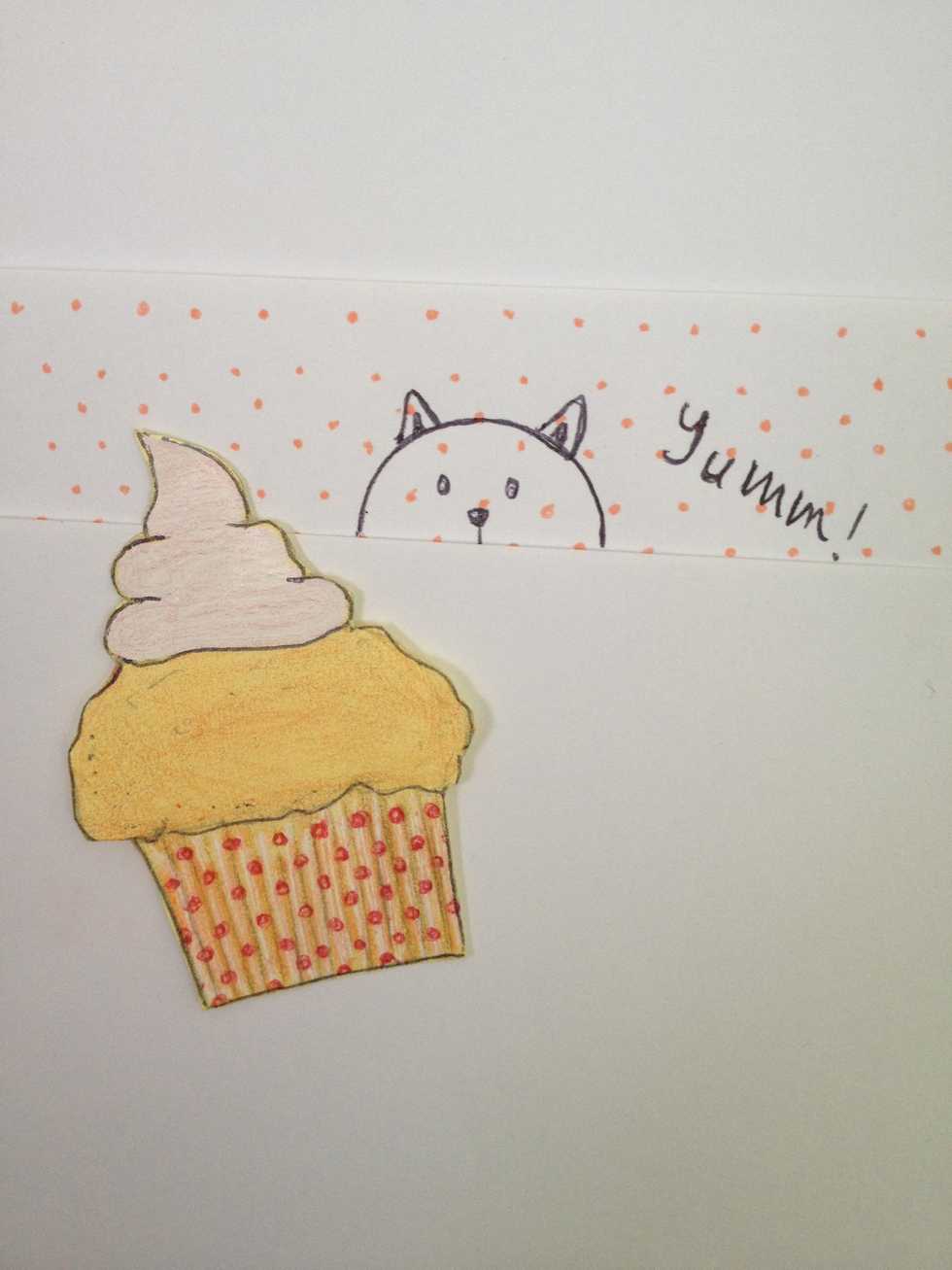Draw cream for cup cake toppingDraw cake 😋Draw Cup cake paperThen apply Color : white for cream , brown and orange for cake , red and brown for cup cake paper 🍰Tadaa ! Yummy cup cake 😻