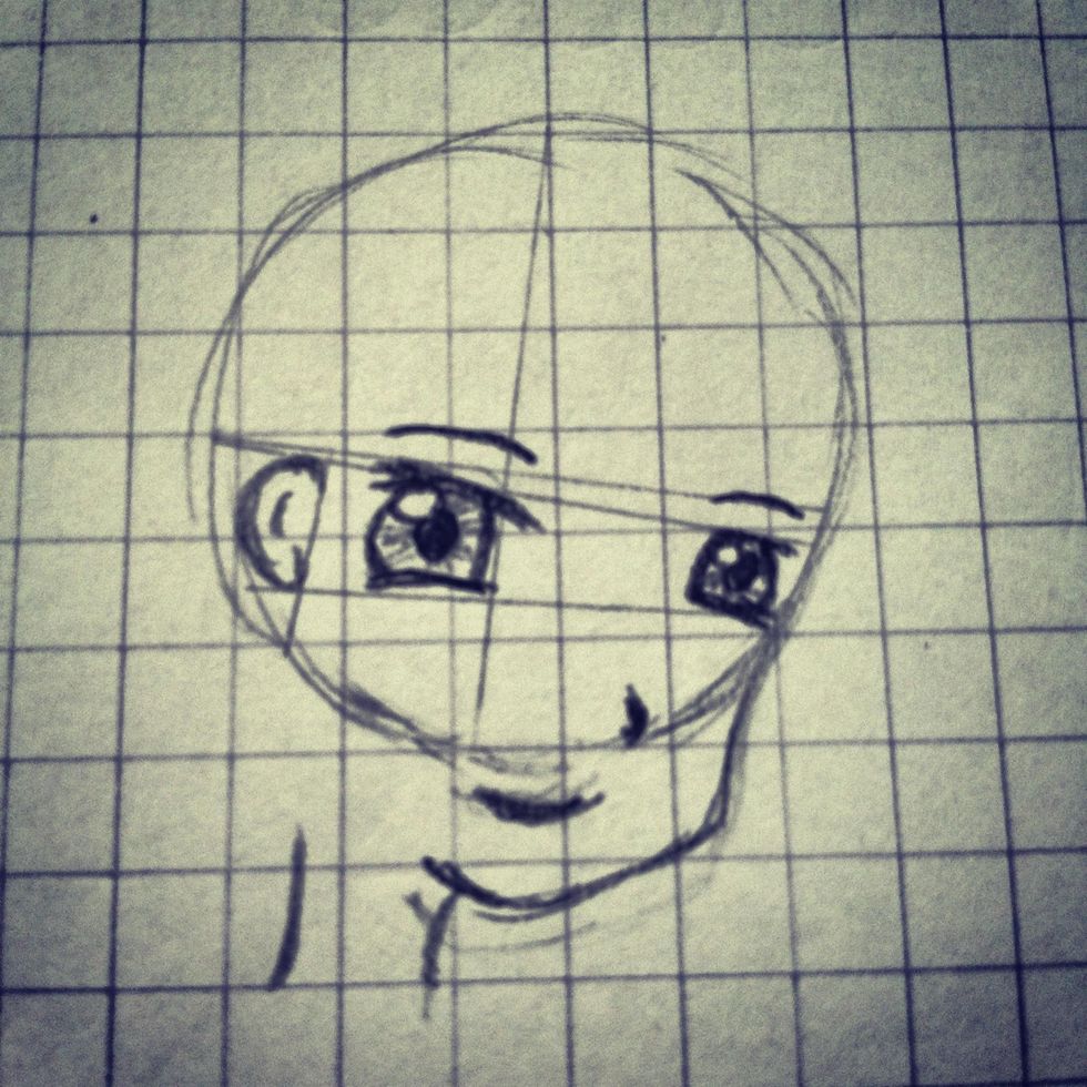 The eyes are the probably most difficult thing. Start with this. Both eyes are placed between the two lines under the cross line.