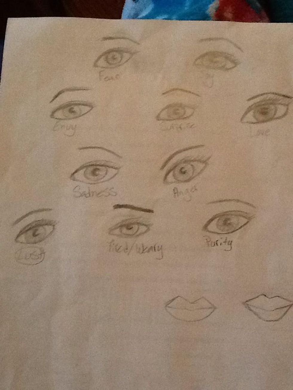 Here are some of the important ones! Fear, joy, envy, surprise, love, sadness, anger, lust, sleepy, and innocence. Please ignore the lips at the bottom sorry XD