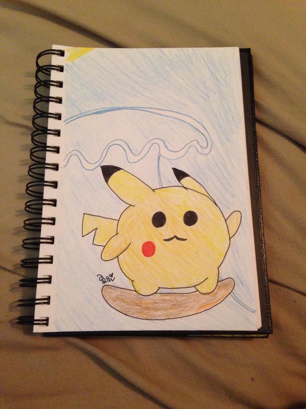 6. Now finish the wave by lightly going though Pikachu's body. Then add the surfboard going though the legs legs.