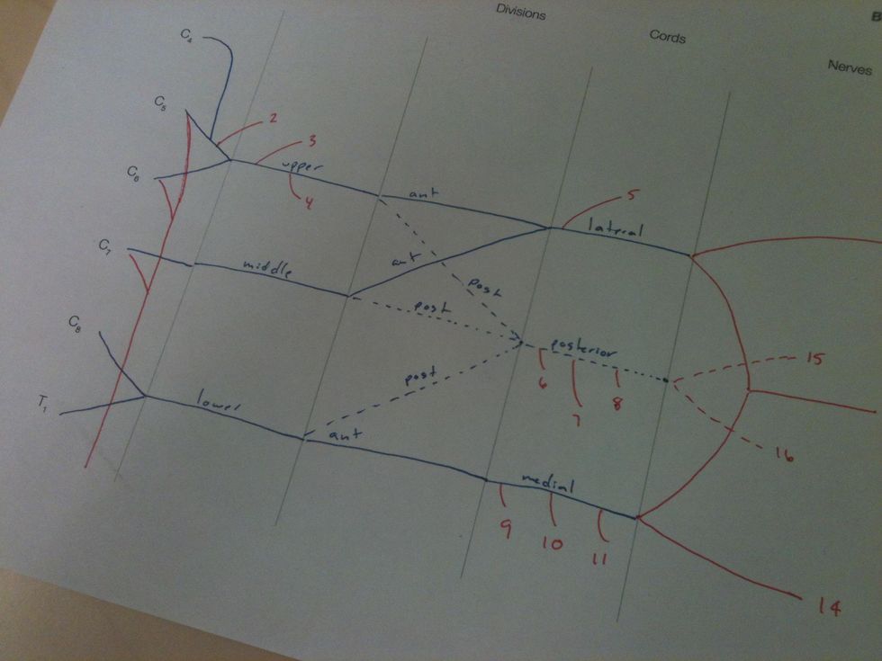 How to draw the brachial plexus including the 16 peripheral nerves. The target audience is medical, dental, PA, and PT students of anatomy.