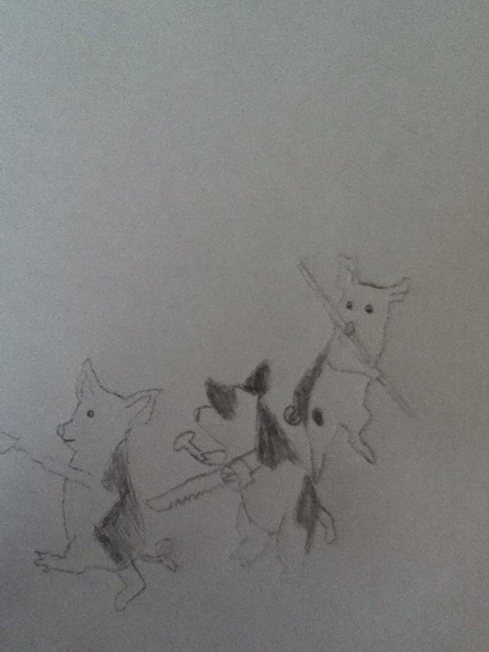 Start with pig three, the leader. Draw his back and back ear.