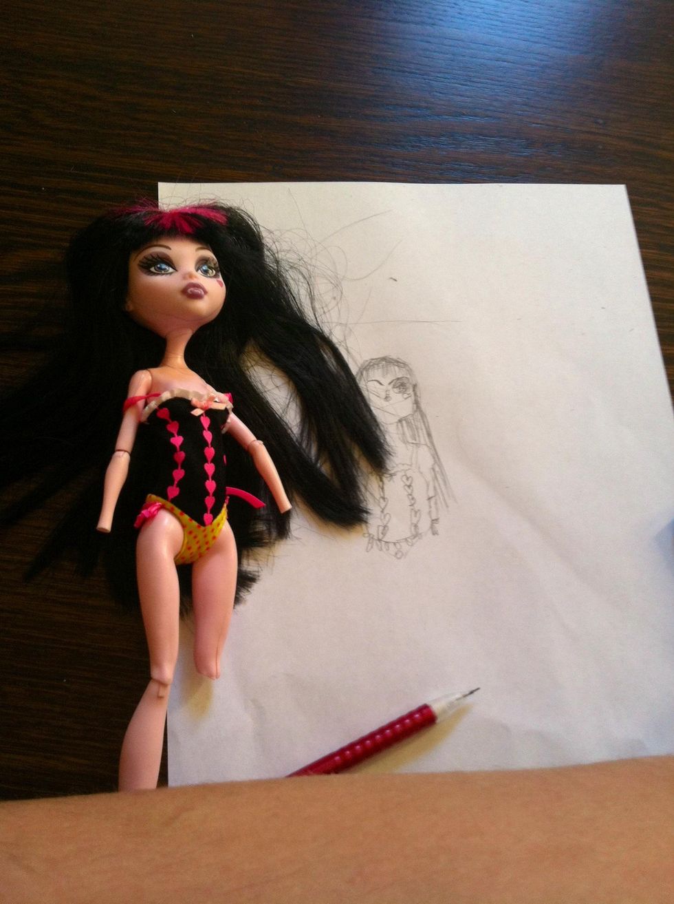This doll is the one I will b drawingDraw the basic shape of the headNow draw some of the hair,neck,and earsNow do the armsNow start to draw the clothesNow finishDo the face featuresLook!