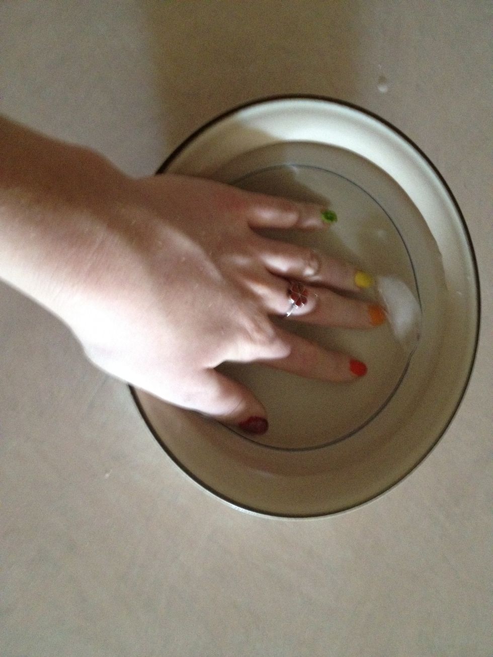 Soak your wet nails one hand at a time in the bowl. You don't have to leave them in very long, just until the water gets uncomfortably cold. I recommend doing this twice for each hand.