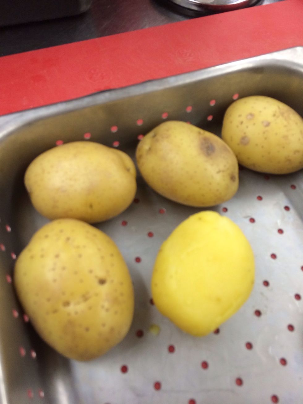 Steam at 225F (107C) for 30 minutes. Don't peel or cut potatoes.