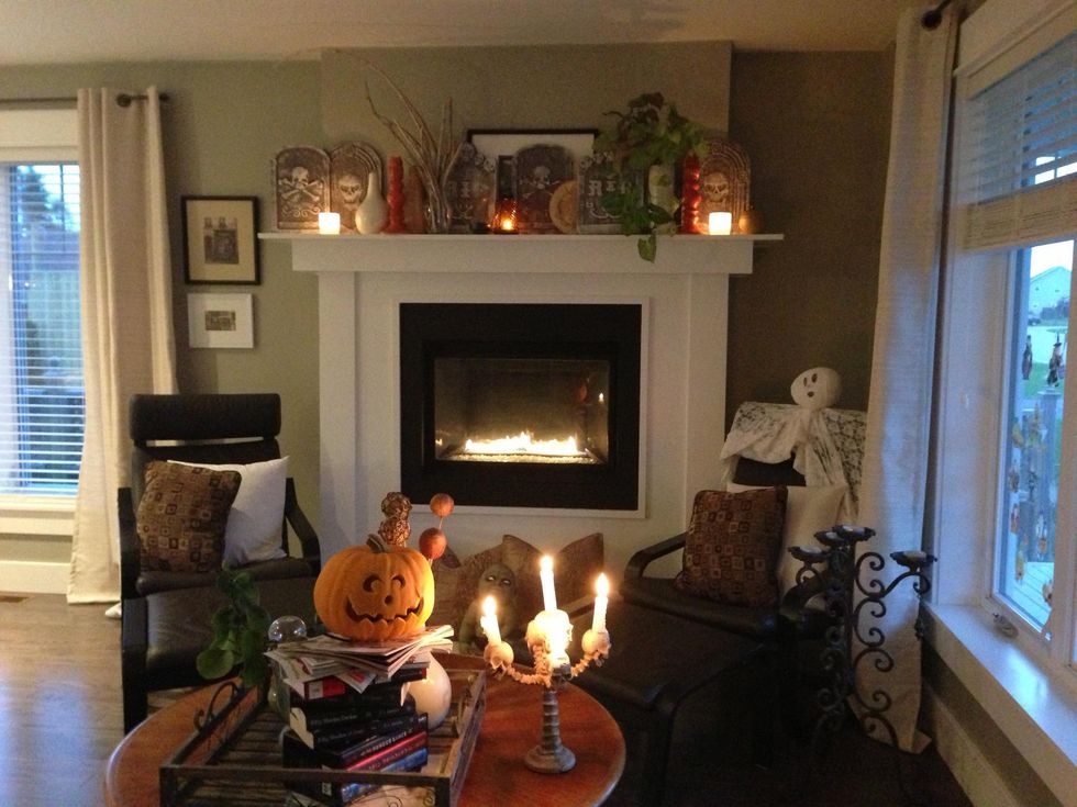 Evenly distribute or scatter the tombstones and the candle/votive holders on the mantel shelve. Place the lantern in the centre and the tree branches filled vase close to it.