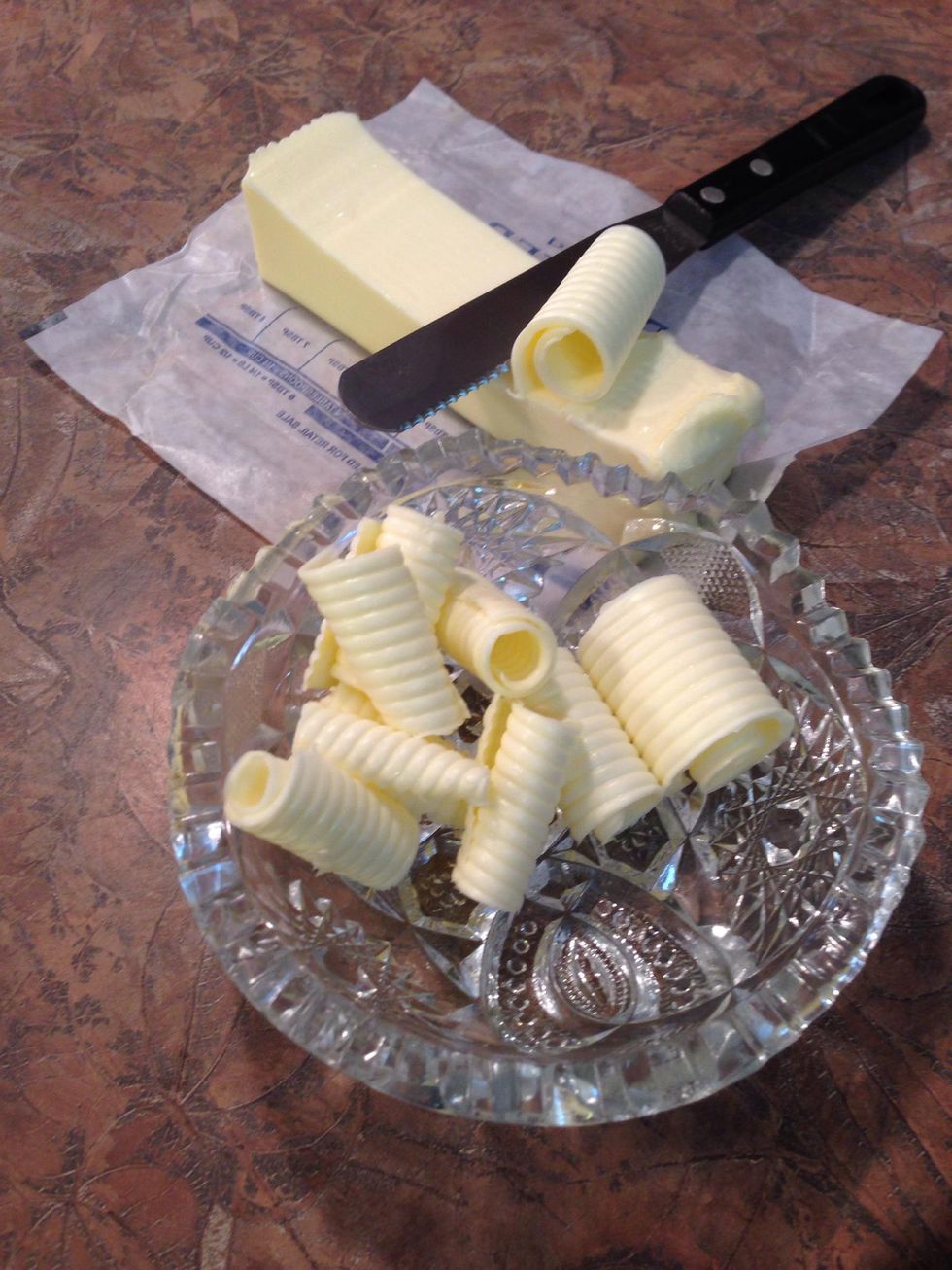 Butter stick must be frozen. Knife must be serrated & not too large/thick. I prefer the wider shaped butter knife shown. A pretty dish is nice.