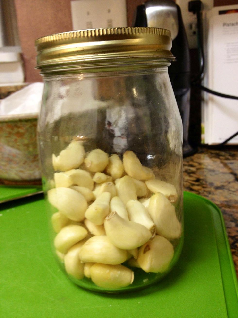 Peel away the outside paper encasing the head and discard and then add your unpeeled cloves to a jar. Close the lid tight and shake vigorously for 20-30 seconds.