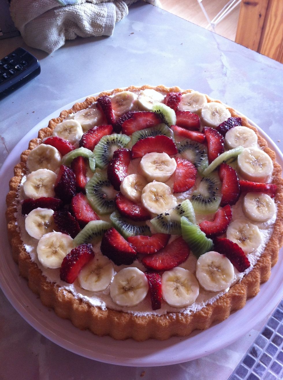 Add cream to flan and spread evenly then add the fruits on top