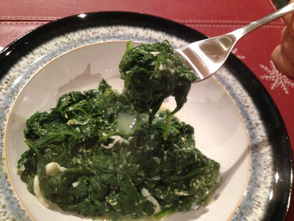 As much spinach as you wish, 1 or 2 eggs (or 3 if you wish), and any type and amount of milk - very flexible. I used 2 big bags of spinach, 2 eggs, and 1/2 cup milk.