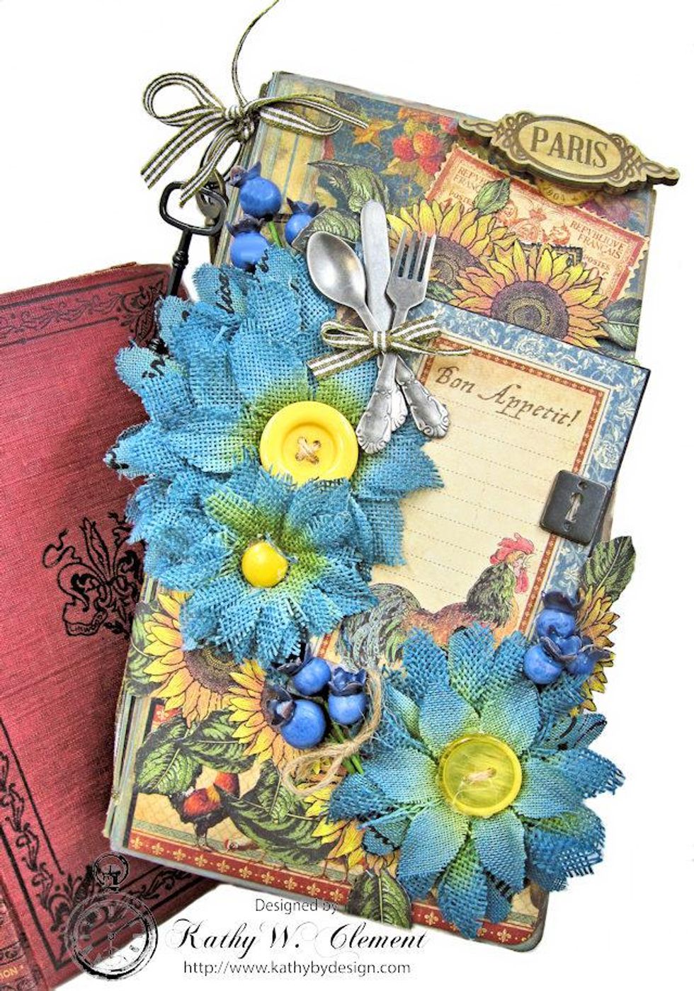 Tie Tim Holtz silverware together with ribbon and glue in place. Add a small keyhole to the journal card, if desired.