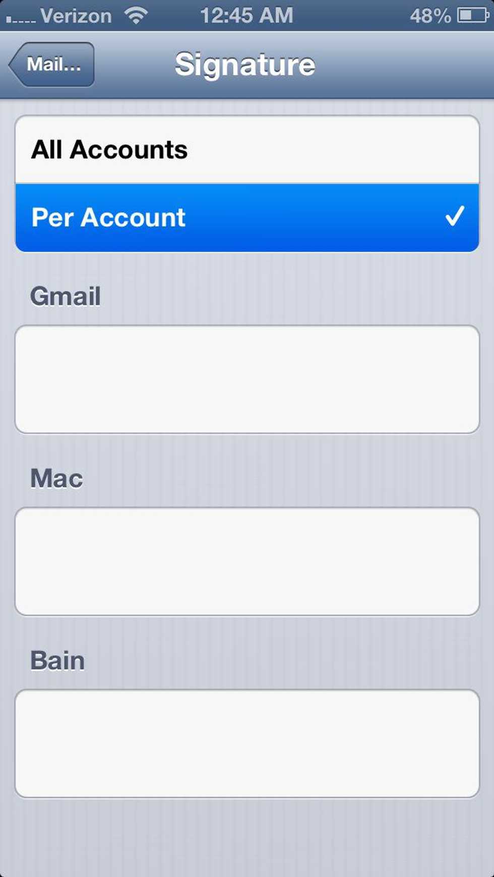 Tap Per Account and fill-in the signature you would like to use for each account.
