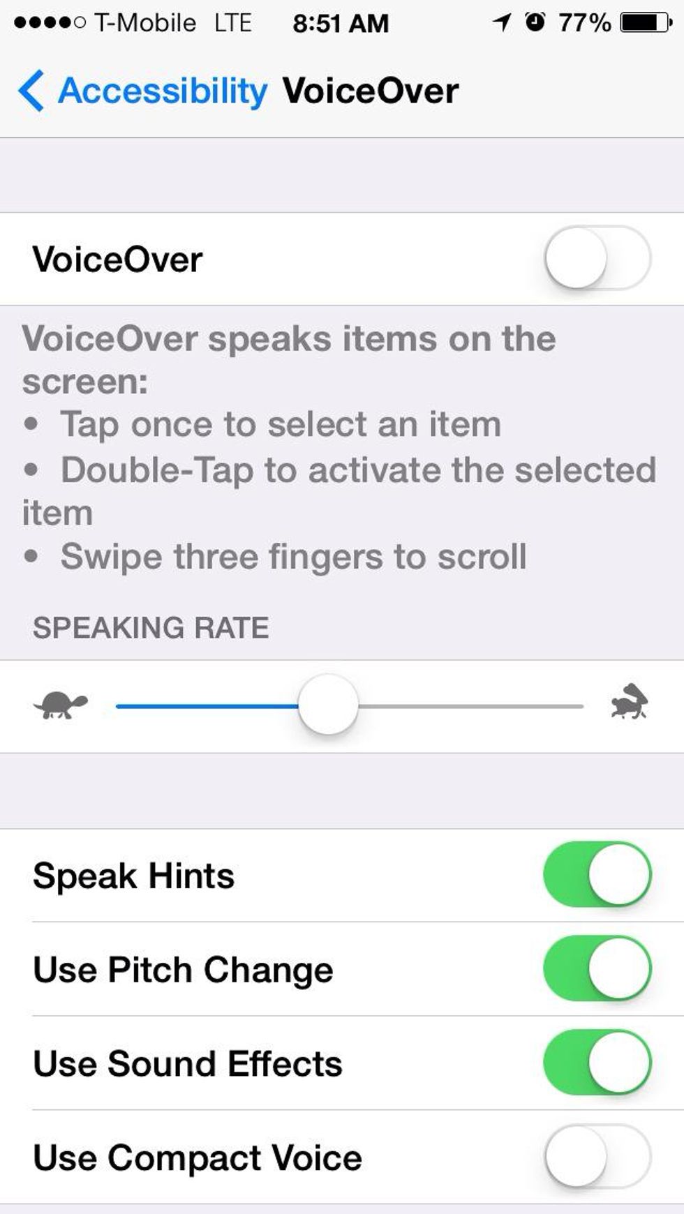 This guide is for devices past the initial iOS setup screens.Tap on SettingsTap GeneralTap AccessibilityTap VoiceOverTap the VoiceOver switch to turn VoiceOver on.Press the home button to return to the home screen.