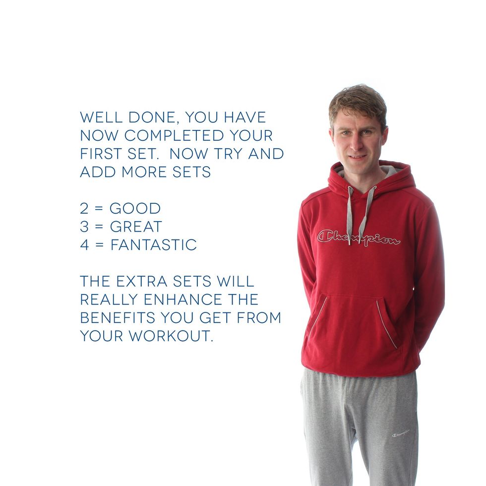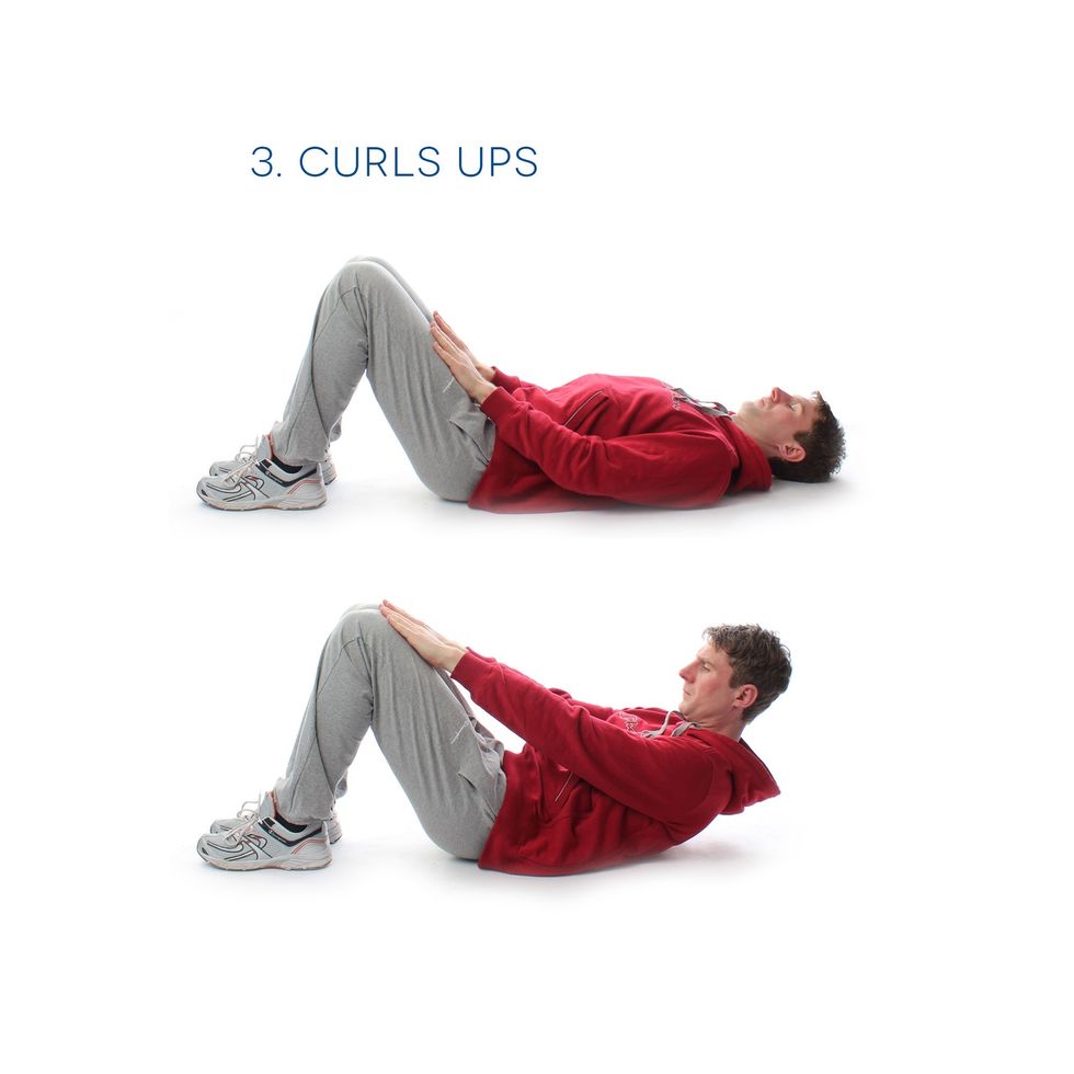 Curl Ups - Time to work the Abdominals. Lie on your back, knees bent, feet flat on the floor & hands on your thighs. Curl up so that your hand reaches your knee & return. Repeat 20 times