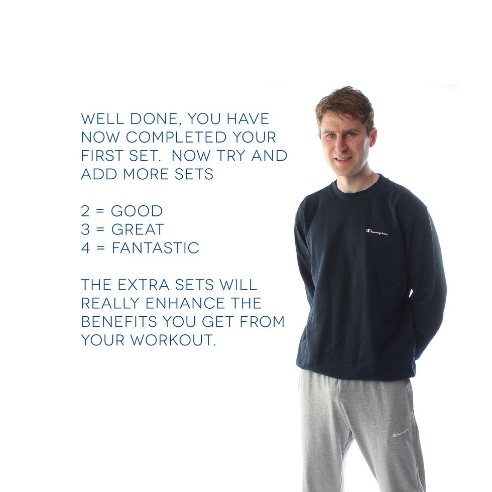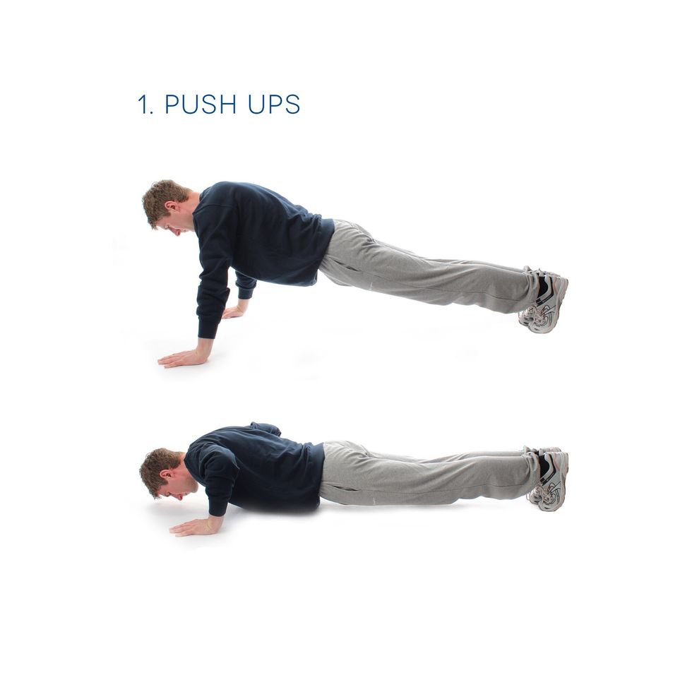 Push Ups - Start in a high plank position keeping a straight line through your body. Lower yourself then push yourself back up. Do this 12 times