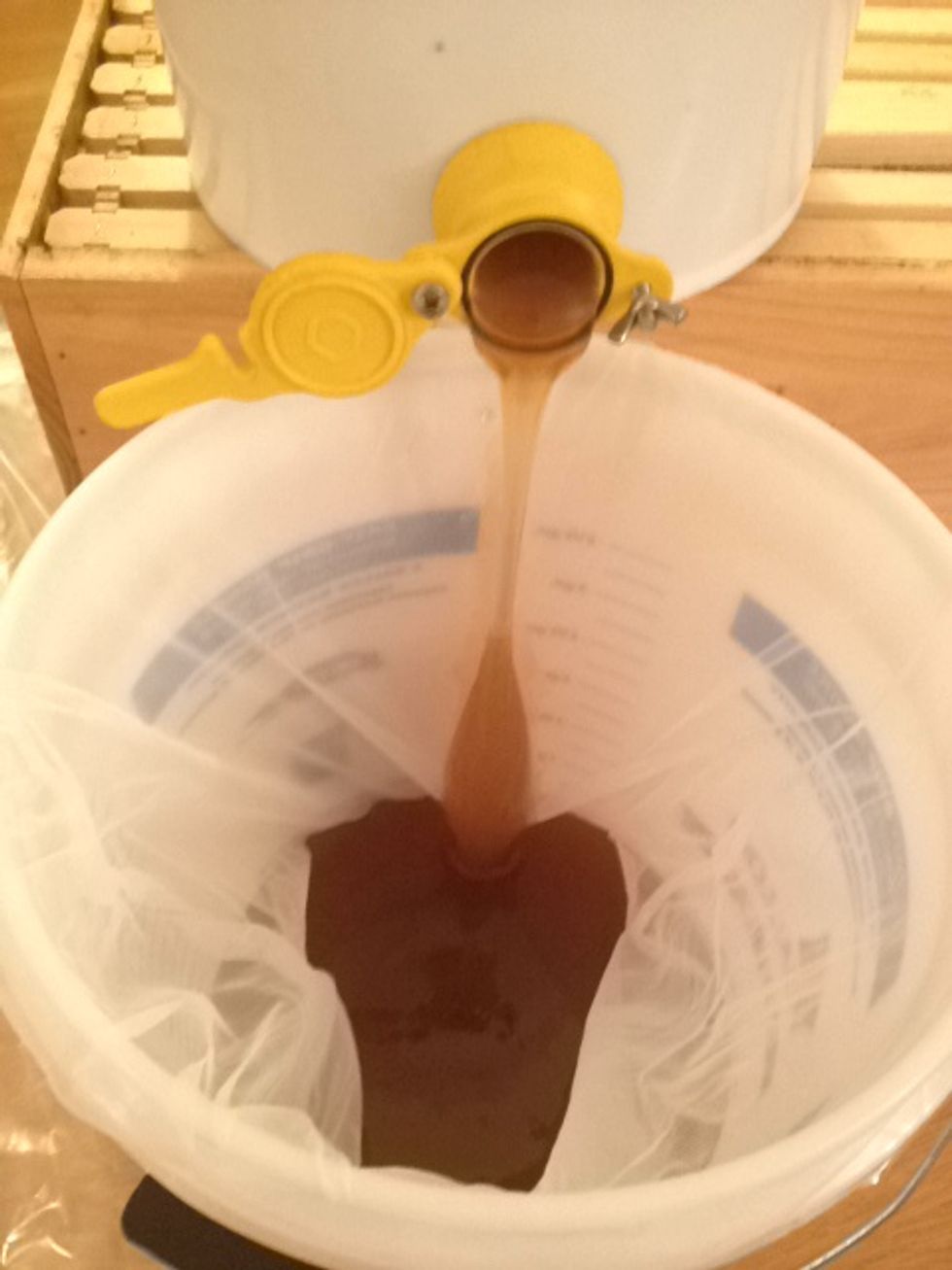 Have a 5 gallon bucket ready, with a nylon strainer placed inside. You can purchase a bucket with a spigot from a beekeeping supply company. It makes bottling much easier then with a regular bucket.