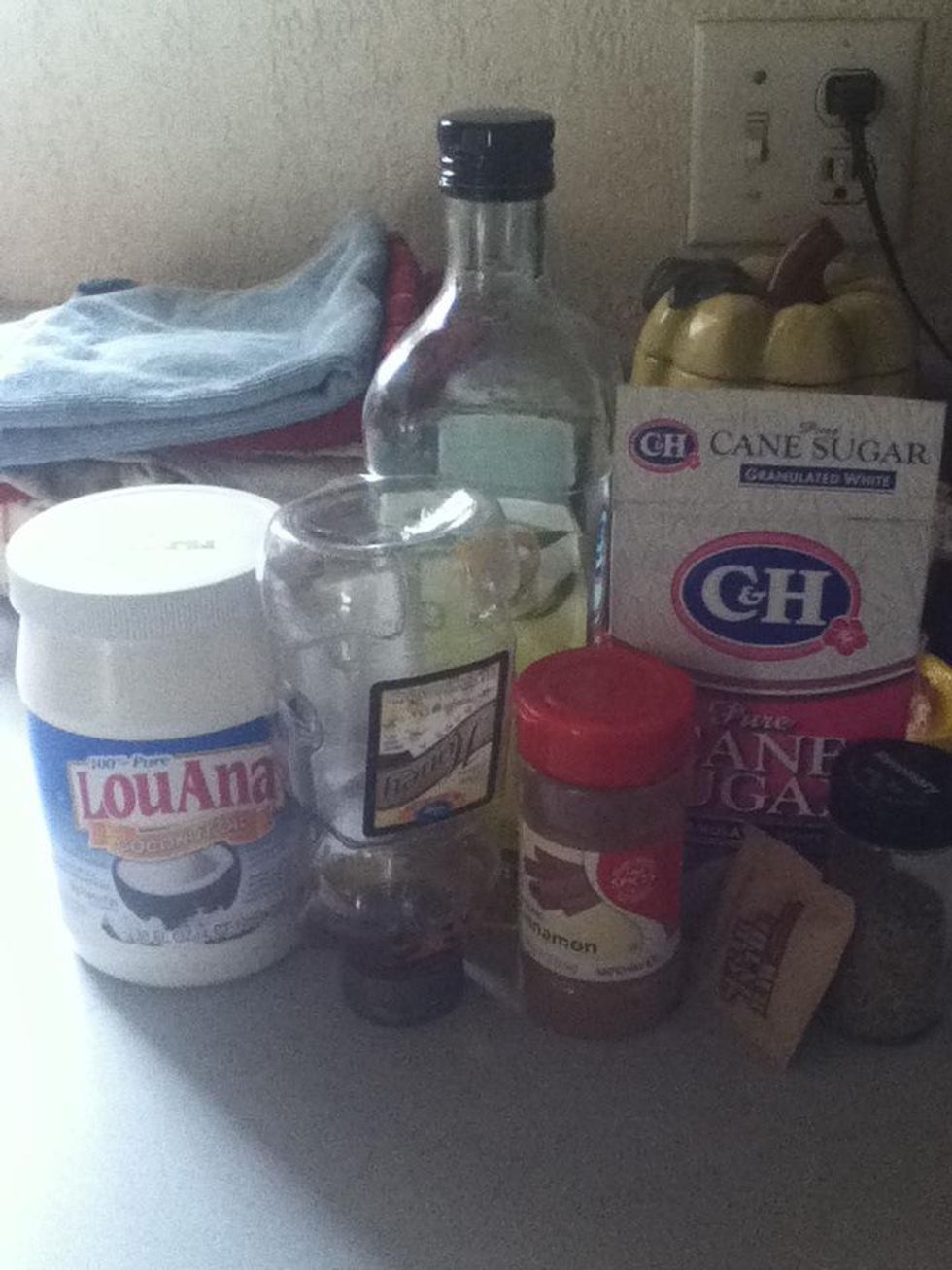 Take your spoon and canister. Spoon coconut oil and place in canister. Then warm to liquid in microwave, stir.