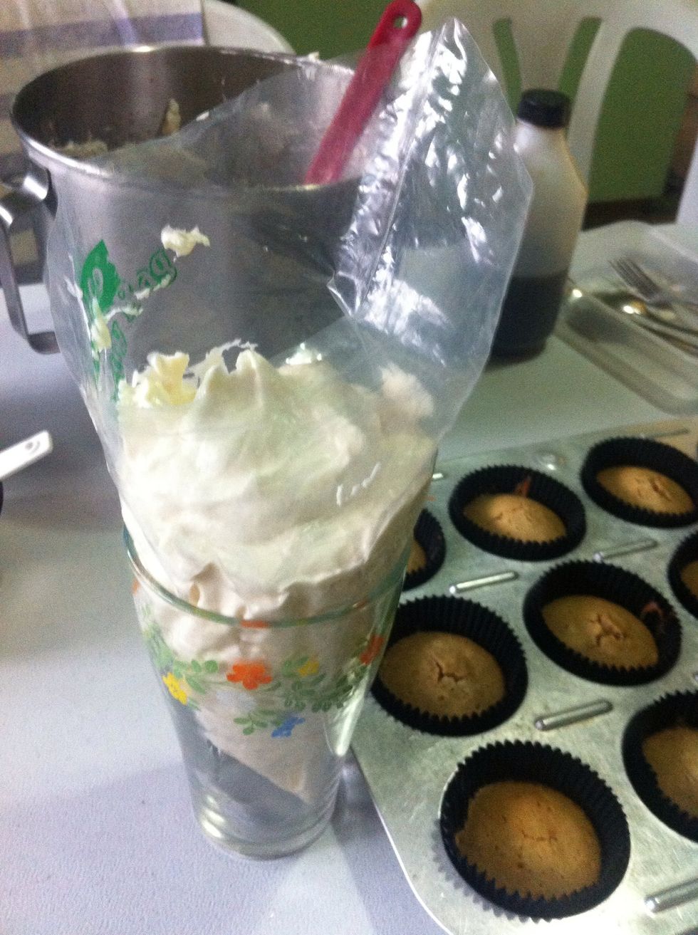 It will be like this once you pull the sides of the pastry bag around the glass mouth. Then you can have enough space to fill with frosting.