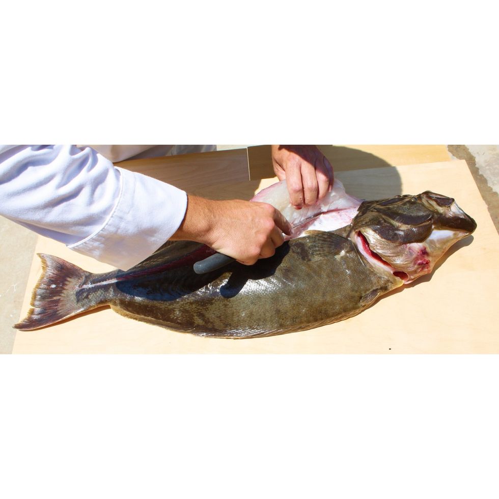 Place the halibut on a flat, sturdy work surface big enough to hold the fish. Make a cut along the gill plate to the bone.