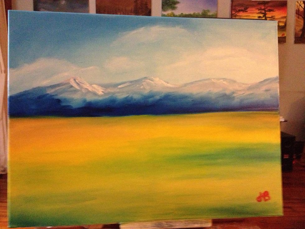 Once your yellows are complete, mix some blue and green together for your shadow color. Keep your fingers moving horizontally, following the lay of the land.