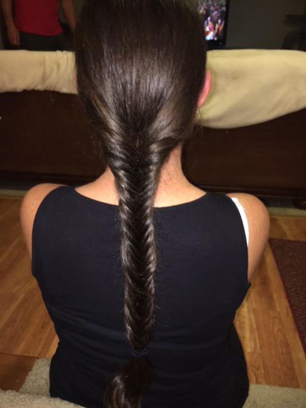 Take a small piece of hair from the far end of the left side and bring it over to the inside of the right half.