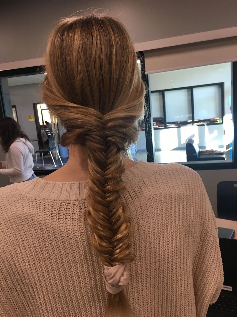 Afterwards separating your hair, start the fishtail braid by taking a small piece of hair from the far end of the left side and bring it over to the inside of the right half.