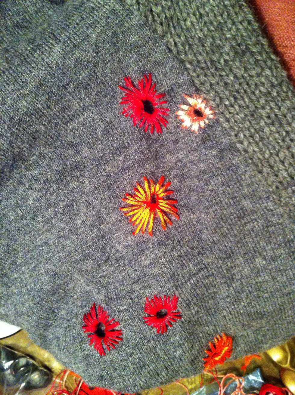 Make a flower centered around each hole. Bigger holes need "mending" first.Use matching colours. Or not.Finished. Wasn't ready to throw that one out!
