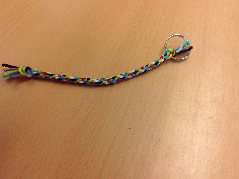 När du är nöjd med längden tar du bort flätskivan, sätter dit en nyckelring och knyter en knut. Klipp bort överflödigt garn.