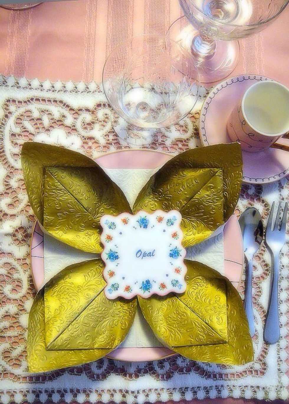 Start with unfolded napkin. Color that you want your petals to be that side gas to face the table