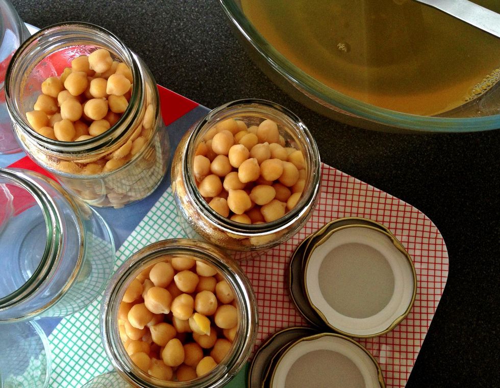 Wash the jars in boiling water to sterilise them. Cook (or part cook) beans according to the instructions on the packet and transfer to a bowl to stop them cooking further. Here I'm using chickpeas.