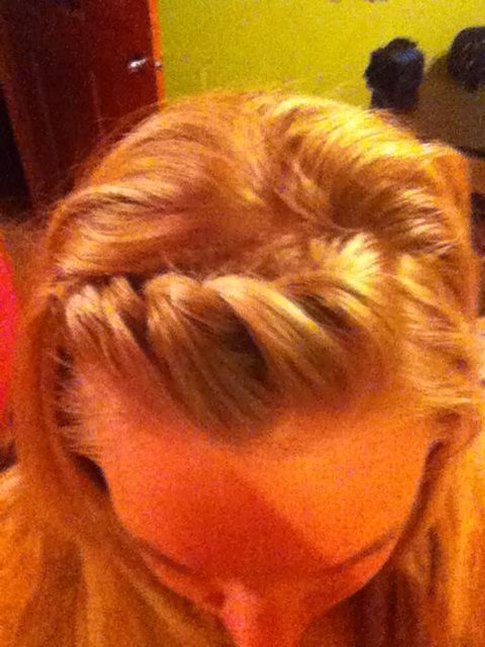 Twist those two pieces. Grab a small or large section from the hair closest to your forehead, add it into the closest half that you twisted. Repeat with other half of twist. Twist again.